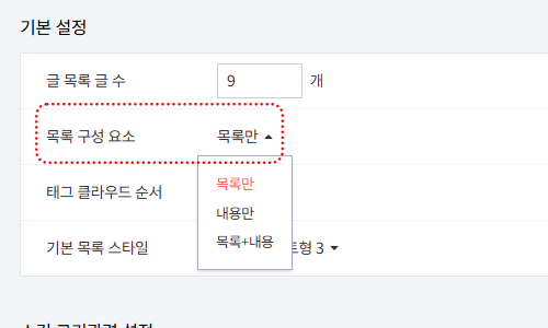 * 스킨편집하기창에서 목록 구성 요소를 모두 목록만으로 설정해주세요.