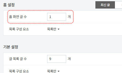 * 스킨편집 - 최신글 - 홈 화면 글 수 1개로 설정해주세요.